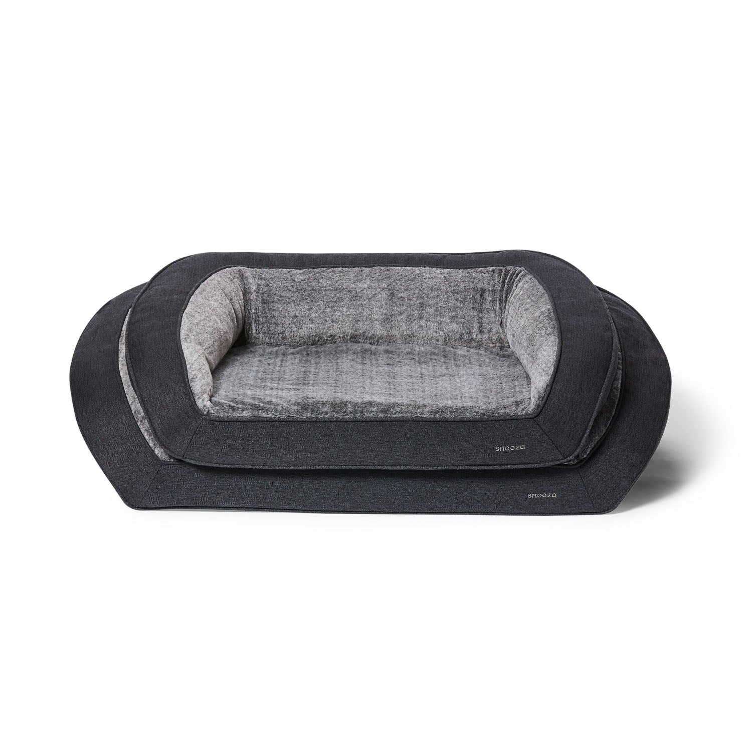 The Ortho Sofa is finished in upholstery-grade furnishing fabric and a super cosy dense pile of charcoal plush that lines the entire interior of the bed. The Ortho Sofa Chinchilla features zippered removable covers for easy washing and each individual bolster is removable, replaceable, and of course washable.
