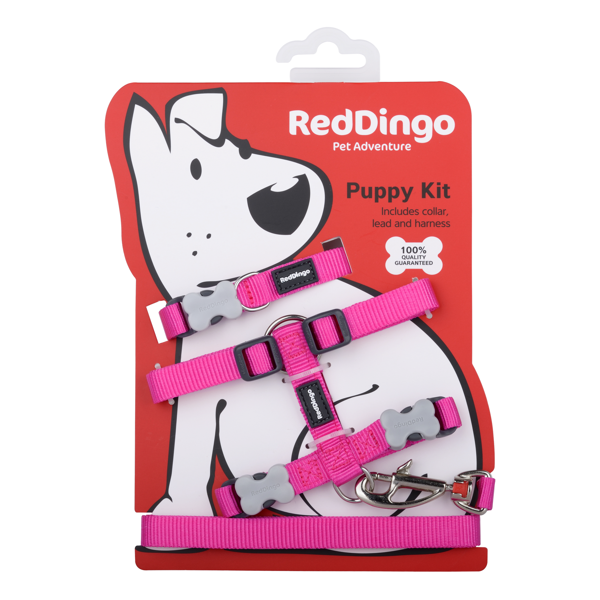 The Red Dingo dog accessories are strong, durable, and good-looking. The nylon collars & harnesses feature our iconic Bucklebone clip and stainless steel hardware, and the leads include a padded handle for superior comfort. The Puppy Kit includes a fixed-length leash, an adjustable collar, and an also adjustable harness.