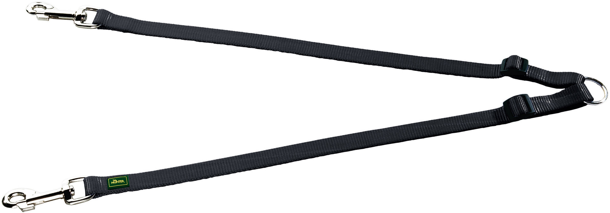 Simply attach your traditional dog leash to the O-ring of the coupling. Both leashes can then be adjusted individually within the range given. The individual adjustability makes it possible to cater to dogs of different sizes. You will still be able to attach or unleash both dogs independently via the two individual buckles.
