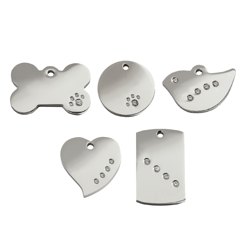 Select from 5 unique designs and a range of sizes in our Swarovski® Zirconia Diamante collection. Individualize the tag of choice with your very own, personalised engraving.