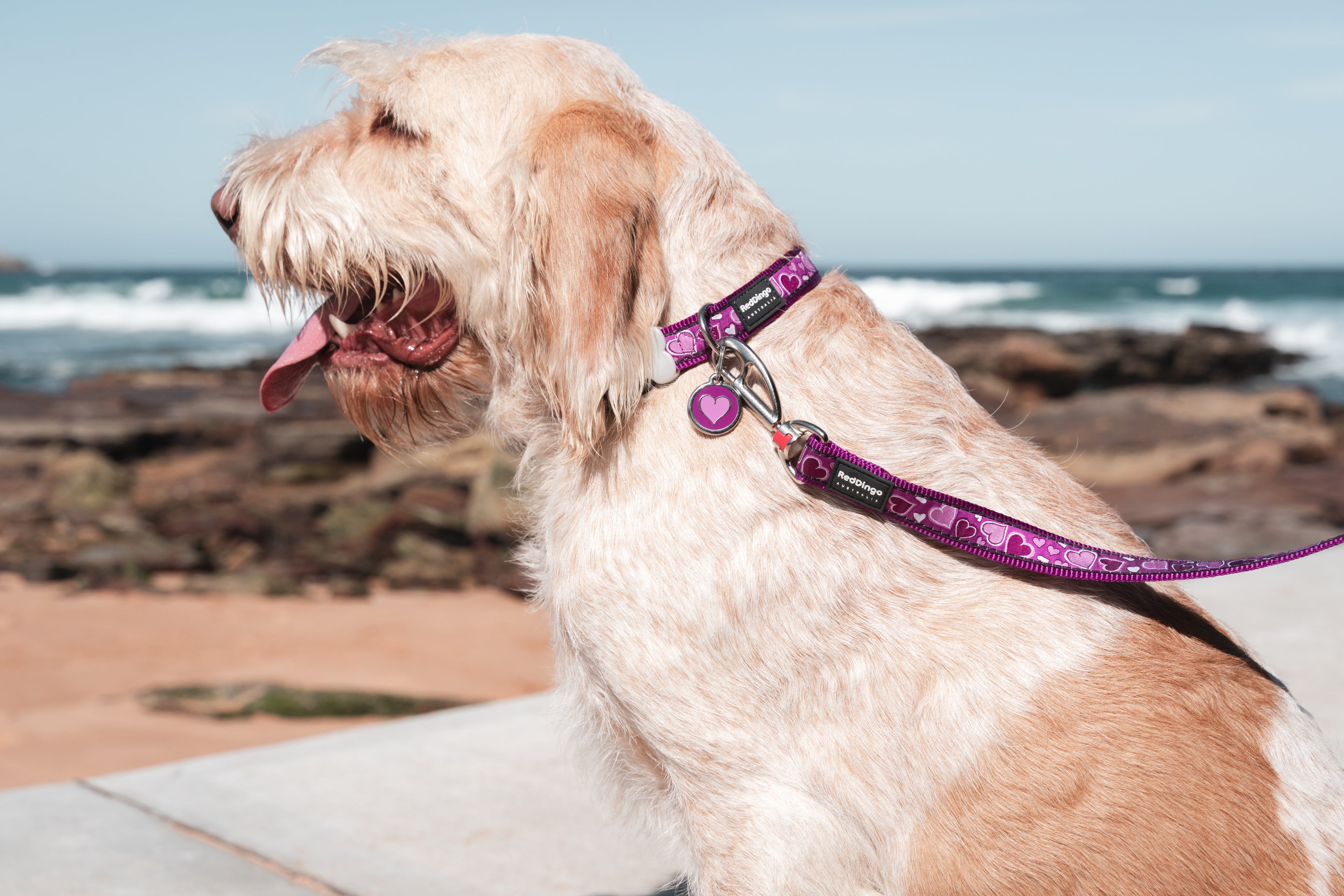 Scruffy wears the Love Heart tag in purple paired with the matching collar & lead. Complete Scruffy's look with the Love Heart tag in purple along with the matching collar & lead.