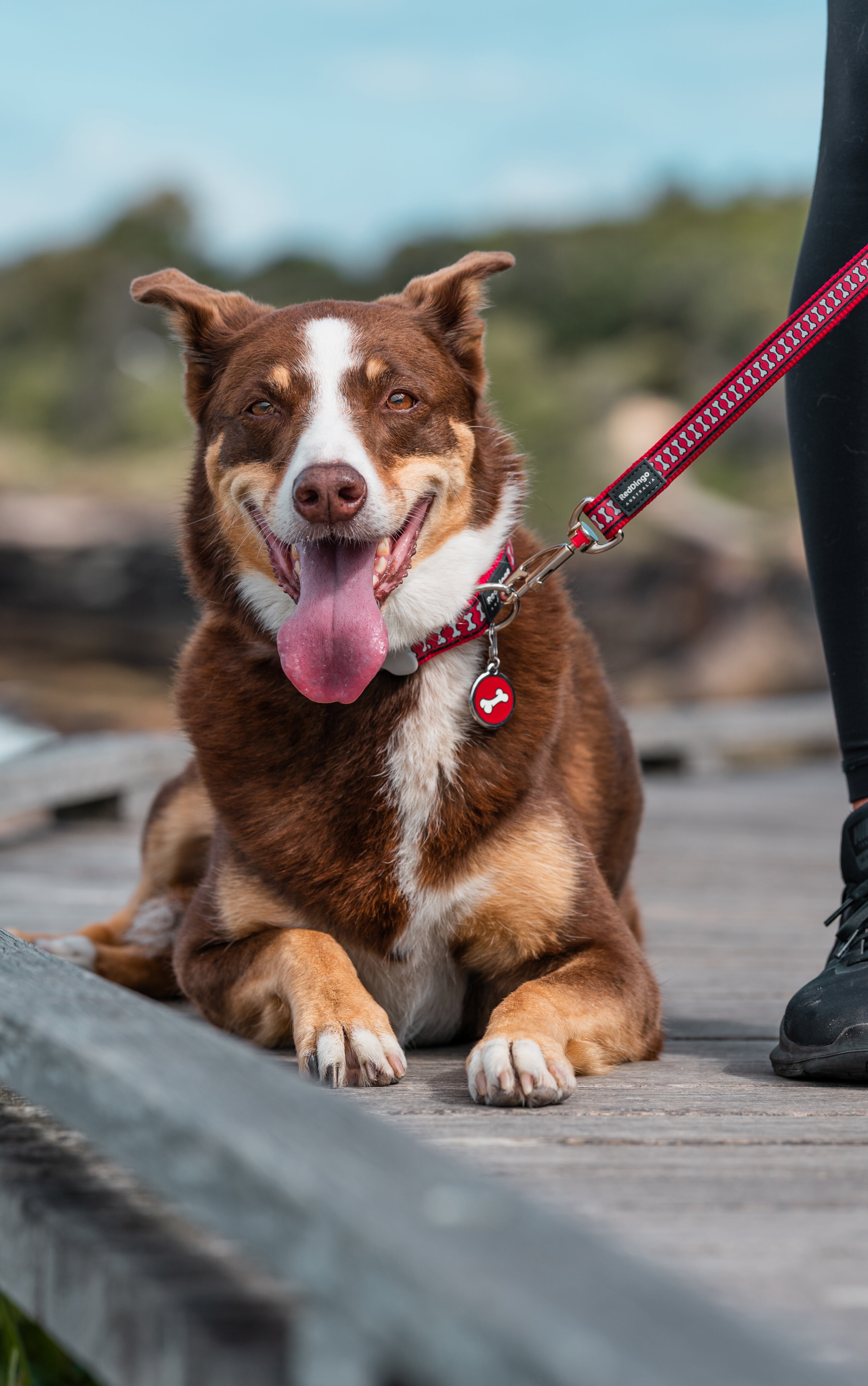 Never goes out of style: The classic 3D Bone ID Tag with matching lead and collar from the Reflective Bones series in red.