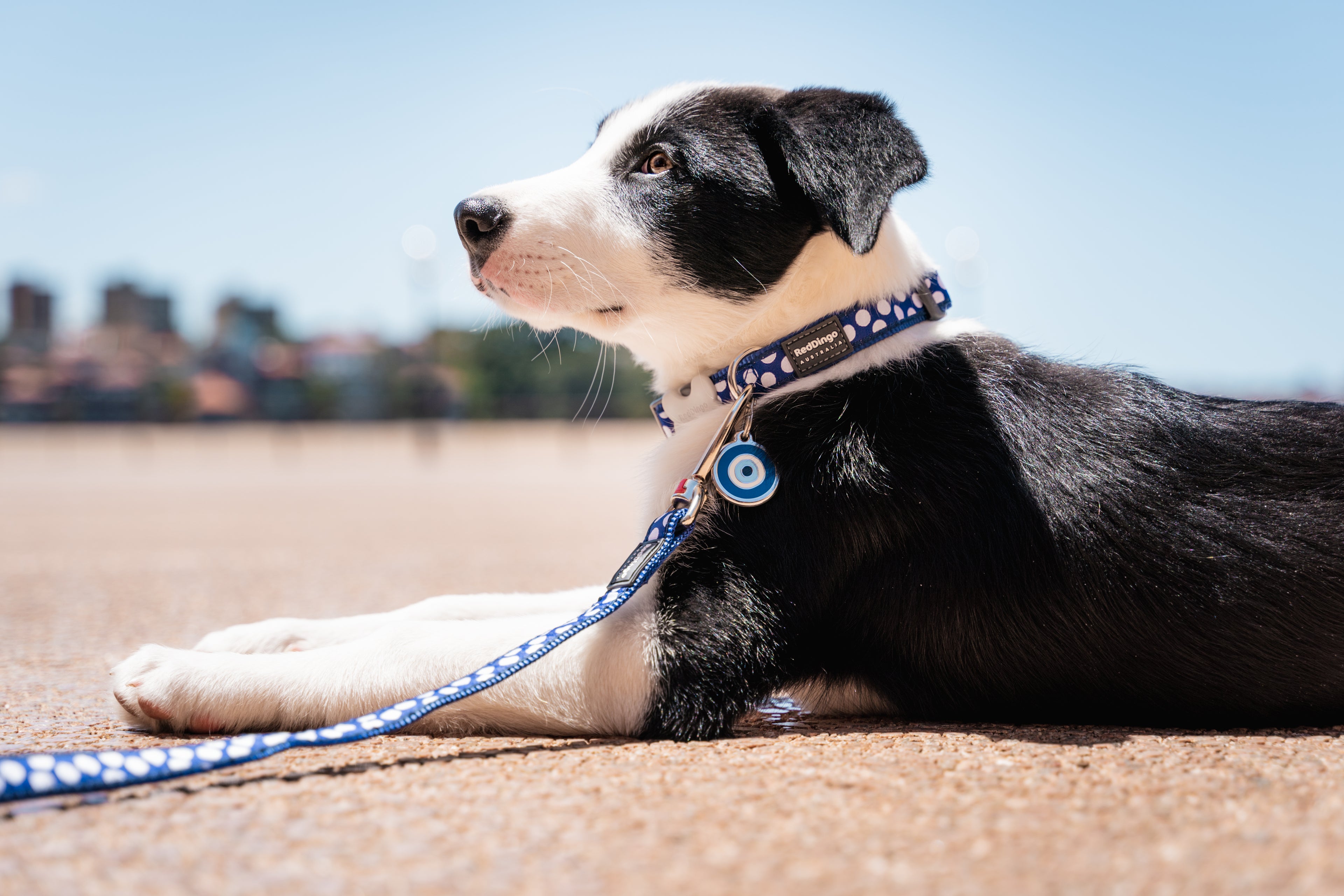 Look who is feeling all trendy and ready to go in his mix & match set consisting of the Evil Eye ID Tag in combination with the collar & leash set Dots from our collection. Yes, it's Rowdy!